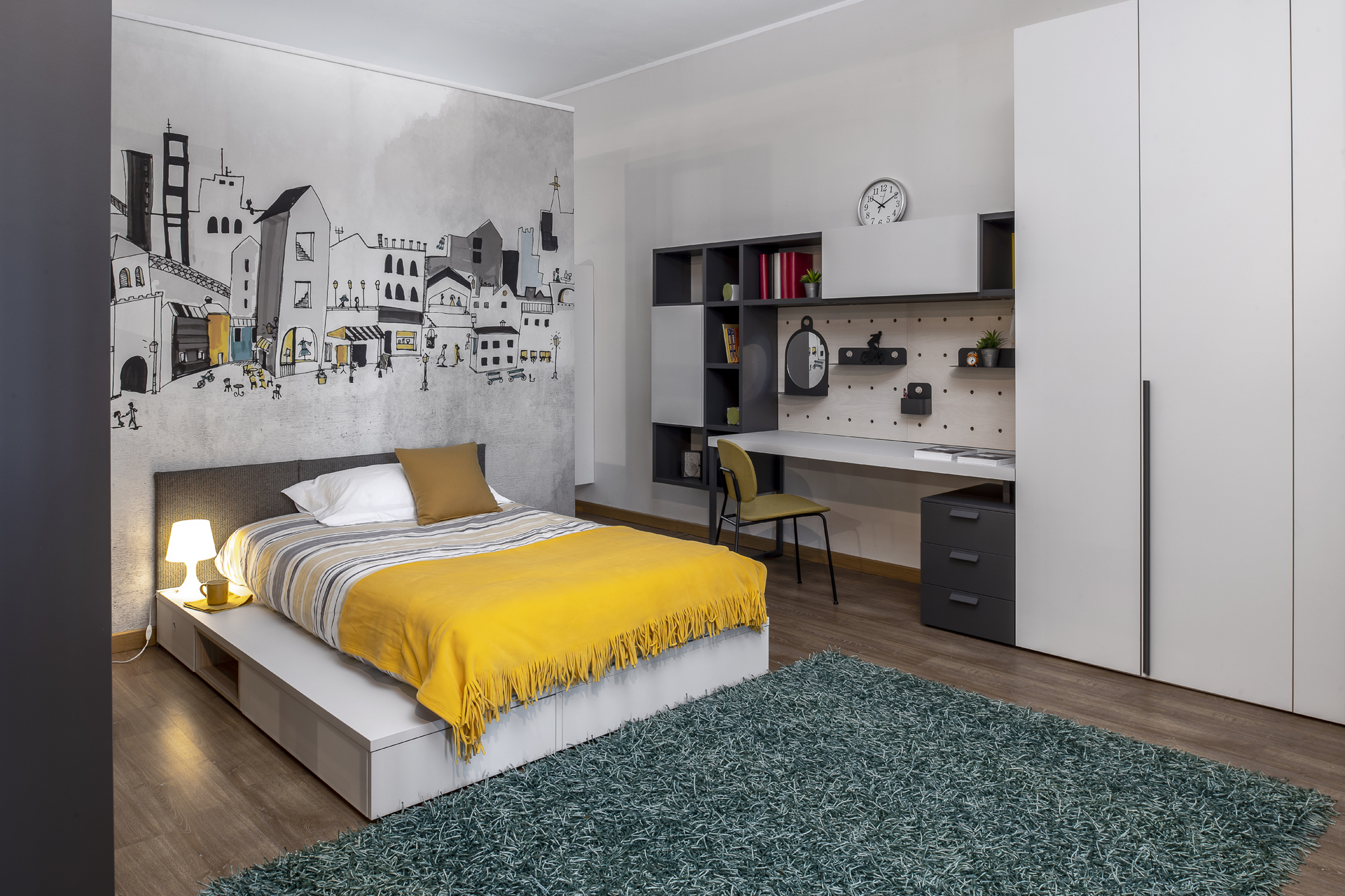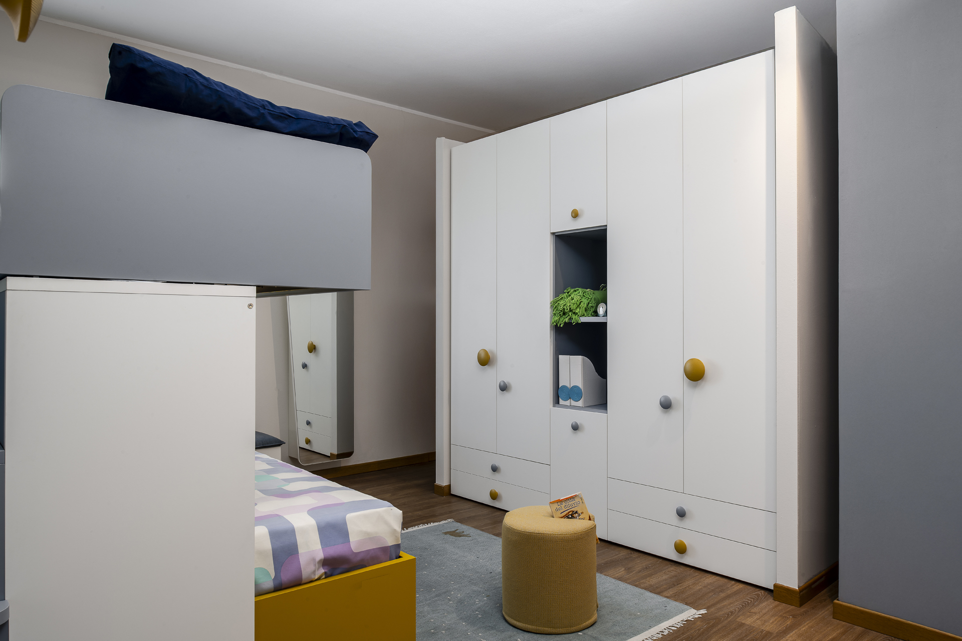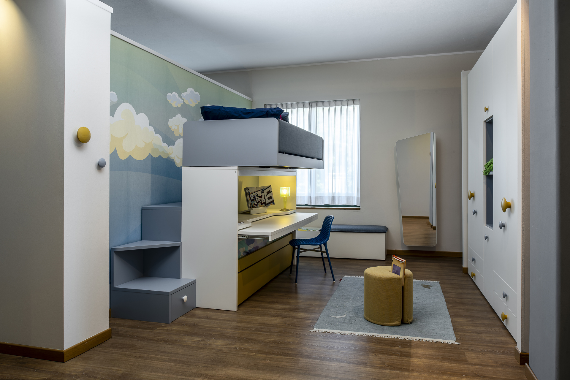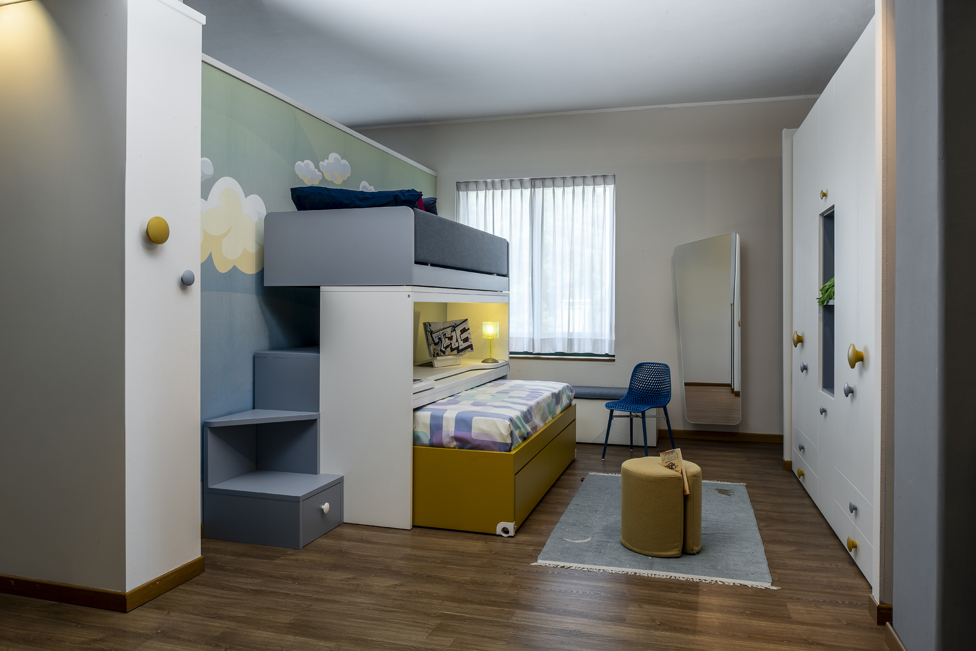 Le camerette per bambini e ragazzi sono tra gli ambienti della casa più mutevoli e versatili. Devono infatti rispondere, oltre che a caratteristiche di estrema sicurezza, per quanto riguarda l’usabilità, ed ecologiche per quanto riguarda l’utilizzo dei materiali, a esigenze spaziali diverse: da angolo per il gioco con gli amici e di riposo notturno, si trasformano in zona studio una volta iniziata la scuola. Le nostre camerette per bambini e per ragazzi soddisfano tutte queste esigenze grazie a modelli originali, studiati in ogni dettaglio per moltiplicare gli spazi a disposizione, grazie a pratici letti a castello con cassetto, letti a soppalco o , angoli scrittoio con cassettiera su ruote, pareti attrezzate con letti sospesi, lettini e scrittoi che scorrono a diverse altezze. Le finiture sono anche in questo caso tantissime e una miriade di colori sono disponibili su misura di bambino e di bambina, dal camomilla al luna, dal color mirtillo, alla ninfea e al pomodoro. Completano le camerette sedie rivestite in ecopelle, scrivanie personalizzabili a parete, armadi modulari installabili a parete, in tonalità fresche e colorate, sorprendenti come l’arcobaleno. Ma anche letti singoli che fondono al design materiali innovativi, come i lettini “decorabili” dai bambini con i loro fantasiosi disegni e poi lavabili che proteggono i sogni dei piccoli di casa in un morbido abbraccio.
